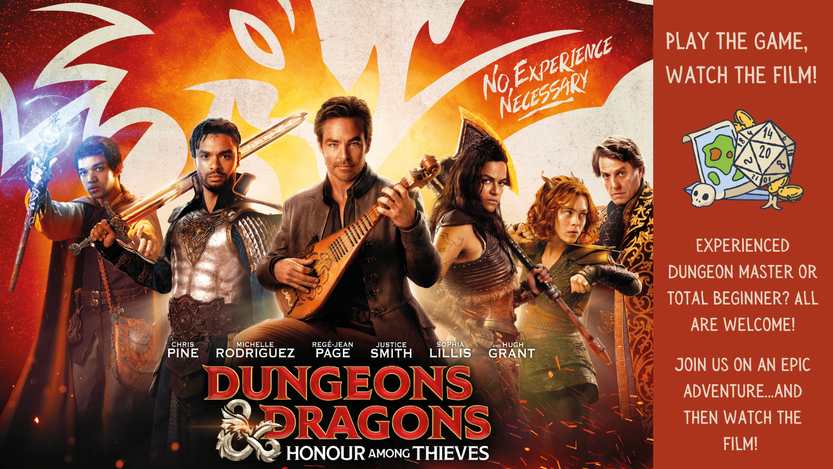 | £6Join us for a day of Dungeons & Dragons fun in our Café Bar (whether you’ve played before or not…no experience necessary!) followed by the incredible new D&D film Honour Among Thieves!